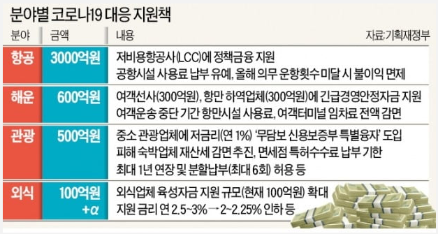 - 여객 수요 및 물동량이 급감한 항공·운수업계와 중국인 관광객 감소 등 수요 위축으로 경영난을 겪고 있는 관광·외식업계에 유동성을 수혈하는 게 핵심이며, 정부는 저비용항공사(LCC)에 산업은행을 통해 3000억원의 저금리 정책금융을, 여객선사와 항만 하역업체에는 해양진흥공사를 통해 각각 300억원 규모의 긴급 경영안정자금을 저금리로 지원하기로 함
