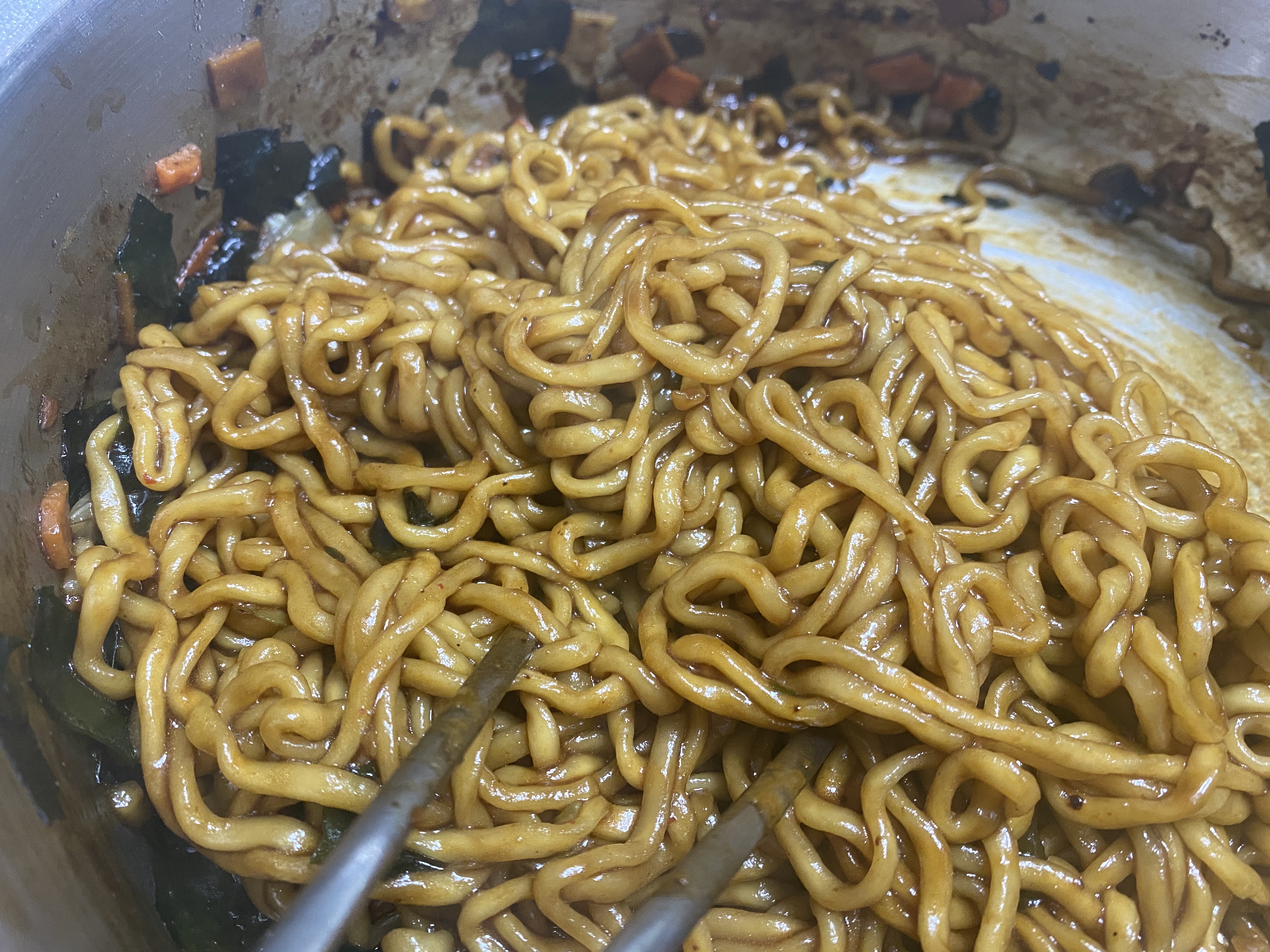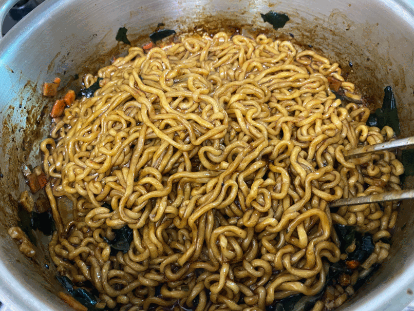 너구리와 짜파게티의 후레이크와 면을 모두 넣고 끓여 줍니다.