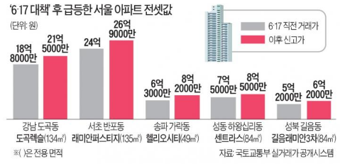 - 6·17 대책 이후 최고가 전세 거래가 잇따르는 것은 재건축 조합원이 새 아파트를 분양받으려면 2년 거주해야 하는 규제 영향이 컸으며, 여기에 전세자금대출을 통한 매매까지 막히면서 전세 수요가 급증함