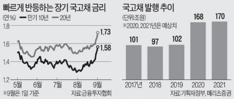 - 1일 금융투자협회에 따르면 10년 만기 국고채 금리는 이날 전날보다 0.07%포인트 상승한 연 1.58%를 기록하며 지난 3월 25일(연 1.65%) 후 5개월여 만에 최고치로 올라섰으며, 정부가 대규모 재정지출을 뒷받침하려고 내년 이후에도 연간 160조원을 웃도는 새 국고채를 쏟아낼 것으로 우려되는 가운데 한국은행의 추가적인 기준금리 인하 가능성이 작아지면서 기관투자가들이 선제적으로 채권을 처분하고 있다는 설명임
