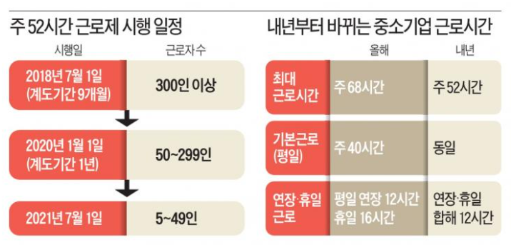 1. 정부가 내년 1월부터 근로자 50~299인 기업에도 주 52시간 근로제를 적용하기로 최종 결정함