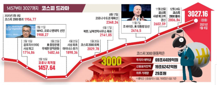 1. 코스피지가 6일 1000선 돌파 이후 약 32년, 코스피지수 2000 시대가 열린 지 13년 만에 장중 3000을 기록함