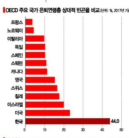 → OECD 주요국가 은퇴은령층(66세 이상) 상대적 빈곤율(중위소득의 절반 이하), 한국 44%로 OECD 최고, 회원국 평균 13%의 3.4배. (아시아경제)
