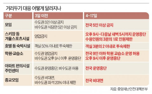 - 수도권 이외 지역은 식당에서만 5인 이상 모임을 못하던 것에서 한층 강화됐으며, 임종을 지키거나 결혼식과 장례식에 참여하는 것을 제외하면 같이 살지 않는 가족이 5명 이상 모이는 것도 금지됨