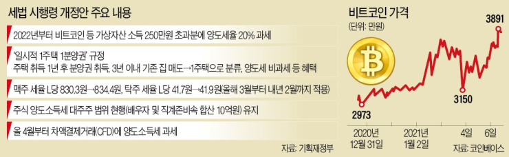 - 개정안에 따르면 올해부터 일시적으로 주택 한 채와 분양권 하나를 보유한 사람도 양도세 비과세 혜택을 받을 수 있게 되고, 맥주와 막걸리 등에 붙는 주세는 3월부터 물가상승률이 반영돼 세율이 소폭 오르며, 내년부터 비트코인 등 가상화폐를 자녀에게 물려줄 경우 상속세가 부과됨