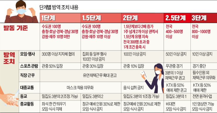 ■ 기존에 3단계로 구분됐던 사회적 거리두기 단계가 5개 단계로 바뀝니다. 코로나19 장기화에 대비한다는 취지인데요. 단계를 올리는 기준은 좀 더 엄격해졌고, 전국 단위보단 권역별로 대응합니다. 문을 강제로 닫는 시설은 줄이는 대신, 기본적인 방역 수칙은 의무화됩니다.